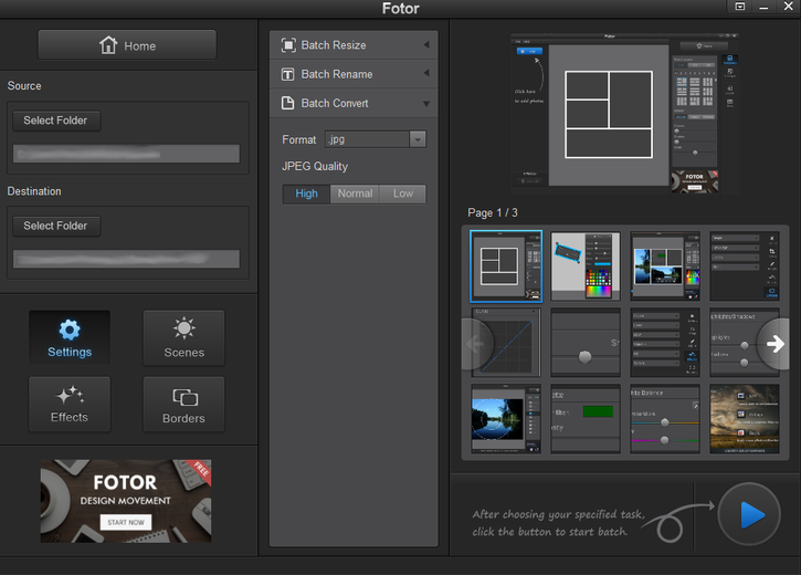 Source(Forrás) - Select Folder (Mappa kiválasztása) gombbal tudjuk megadni azt a mappát, amely tartalmazza az egyidejűleg szerkeszteni kívánt képeinket. A mappában lévő összes képet megnyitja és a változtatásokat alkalmazza rá, így a megnyitni kívánt mappába csak azokat a képeket tegyük, amelyeken változtatni szeretnénk.